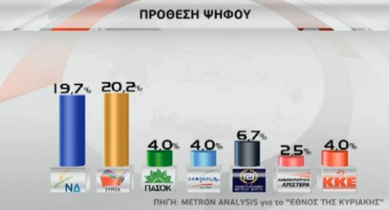 Οριακό προβάδισμα 0,7% για τον ΣΥΡΙΖΑ καταγράφει δημοσκόπηση της Metron Analysis για την εφημερίδα «Έθνος της Κυριακής».